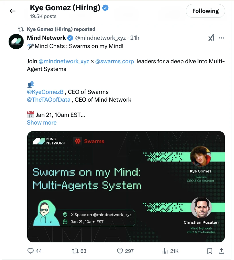 In this process, Mind Network has demonstrated great potential with its leading technology in combining FHE with AI. By providing secure and efficient encryption computing support for multi-agent systems, Mind Network not only enhances data privacy protection, but also promotes innovation in AI collaboration. At the same time, the Swarms team has further promoted the ability of multi-agent collaboration through FHE and built a more secure and efficient consensus framework. With the further development of FHE technology, the integration of AI and encryption technology will become an important development trend in the future digital world.