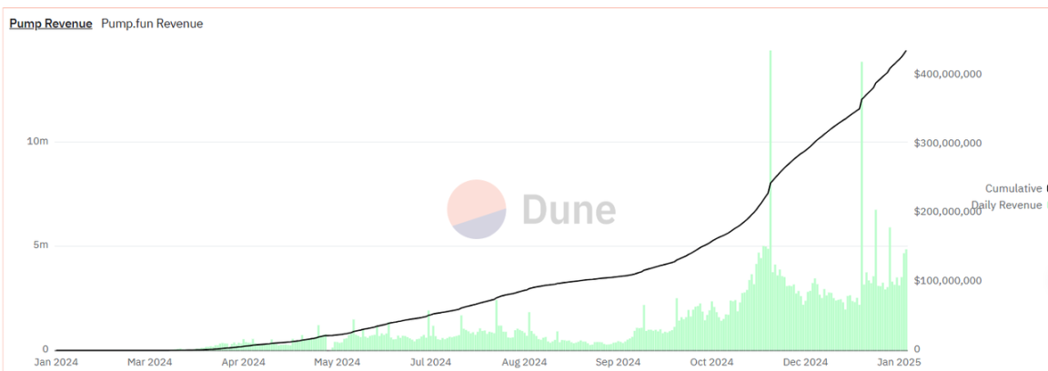 Solana firmly holds the market initiative in AI concept coins and meme coins. Dune data shows that its issuance launch platform Pump.fun has accumulated revenue of more than $400 million to date.