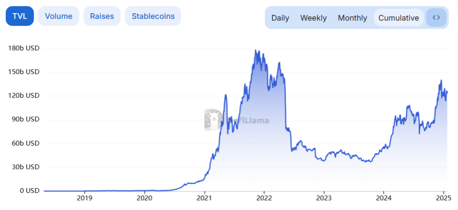 Fast forward to this cycle, the lending and derivatives in the new DeFi protocol did not have many highlights to attract the capital frenzy. Instead, they chose to build their own chains, and value capture did not flow to Ethereum. Some DeFi protocol tokens have repeatedly reinvented the wheel and reached their peak as soon as they went online, which also dragged down the already precarious sentiment of the market. Since 2023, DeFis highlight moment only appeared in the climax of Q4 last year, and then it was submerged again in the meme and AI wave. Data shows that the current total TVL of DeFi is still lower than the peak of US$180 billion set in the previous cycle.