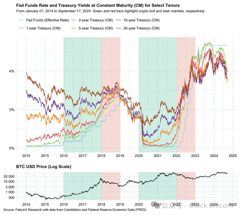 With the Federal Reserve implementing a 50 basis point rate cut in September, the market is preparing for what could be a period of low interest rates, similar to the environment that fueled the crypto bull runs of 2017 and 2020, as shown in the chart below. Bitcoin (and crypto) bull markets are shown in the green zone and typically occur in low interest rate environments, while bear markets are shown in the red zone and typically occur during periods of surging interest rates.