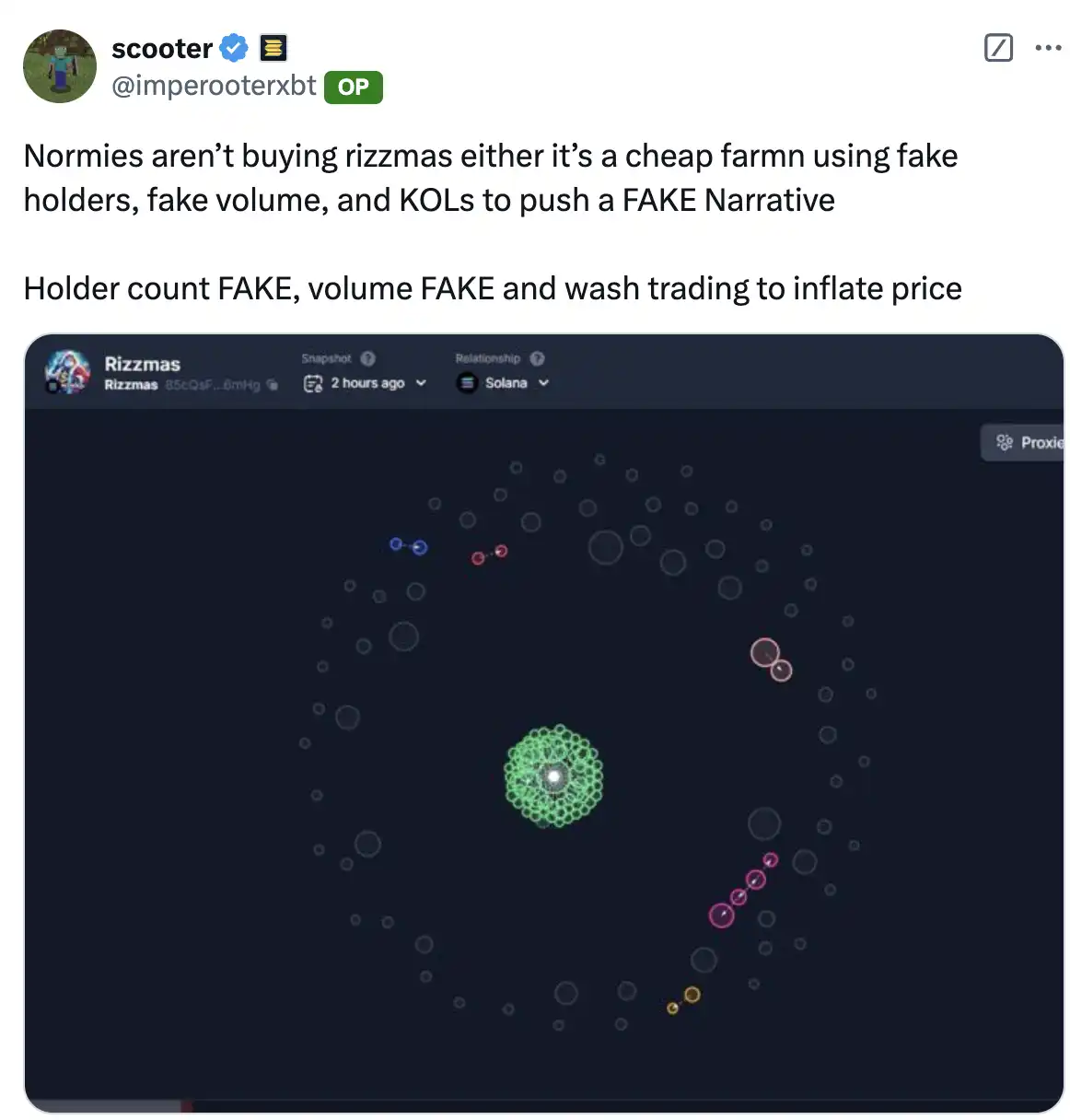 21. Scooter (@imperooterxbt) revealed that Rizzmas was a complete scam, causing its market value to plummet from $100 million to $20 million, and was subsequently criticized by many TikTok users who had invested in it.