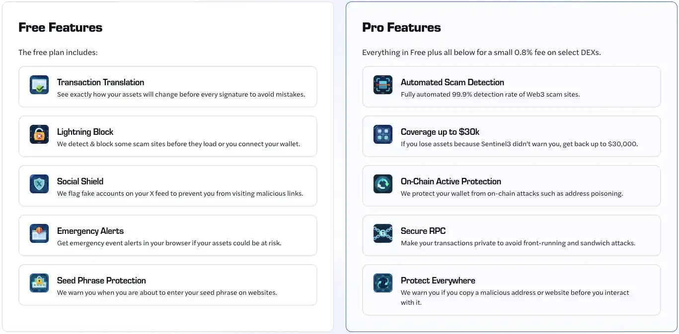 As for Sentine l3, not all users are eligible for claims. Sentine l3s product services are divided into free and paid versions. The paid version requires a fixed fee of 0.8%, and its functions include claim eligibility, RPC service, and anti-address pollution.