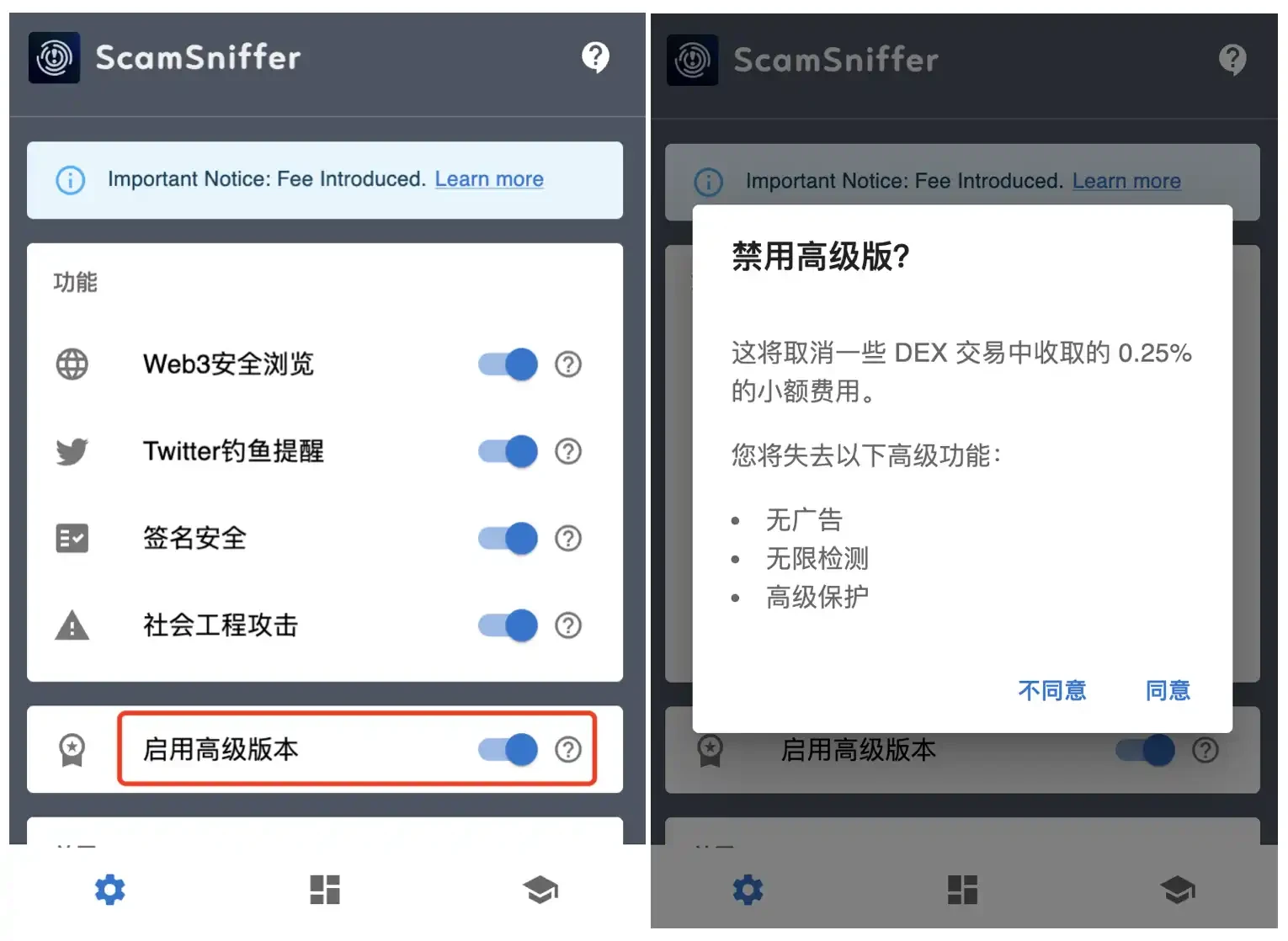 After checking the plugin interface and official website, BlockBeats reporters found that Scam Sniffer has set up a fee notification banner and updated the document to introduce the fee deduction details. In addition, the free version of the plugin has advanced features enabled by default, which has also aroused user doubts.