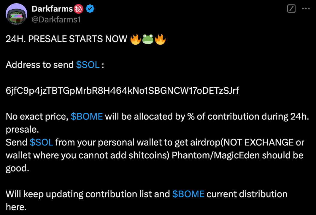BOME (BOOK OF MEME) is a pre-sale project initiated by Pepe Meme artist Darkfarm. The pre-sale raised more than 10,000 SOL. Due to widespread attention, the trading volume of the token exceeded US$200 million after it was launched. Three days after it was launched on Binance, its market value peaked at over US$1 billion. SLERF, which subsequently adopted the same pre-sale mechanism, accidentally destroyed LP and airdrop reserved tokens due to DEV. The sudden incident and subsequent spread caused the price of Meme tokens to spiral upward.