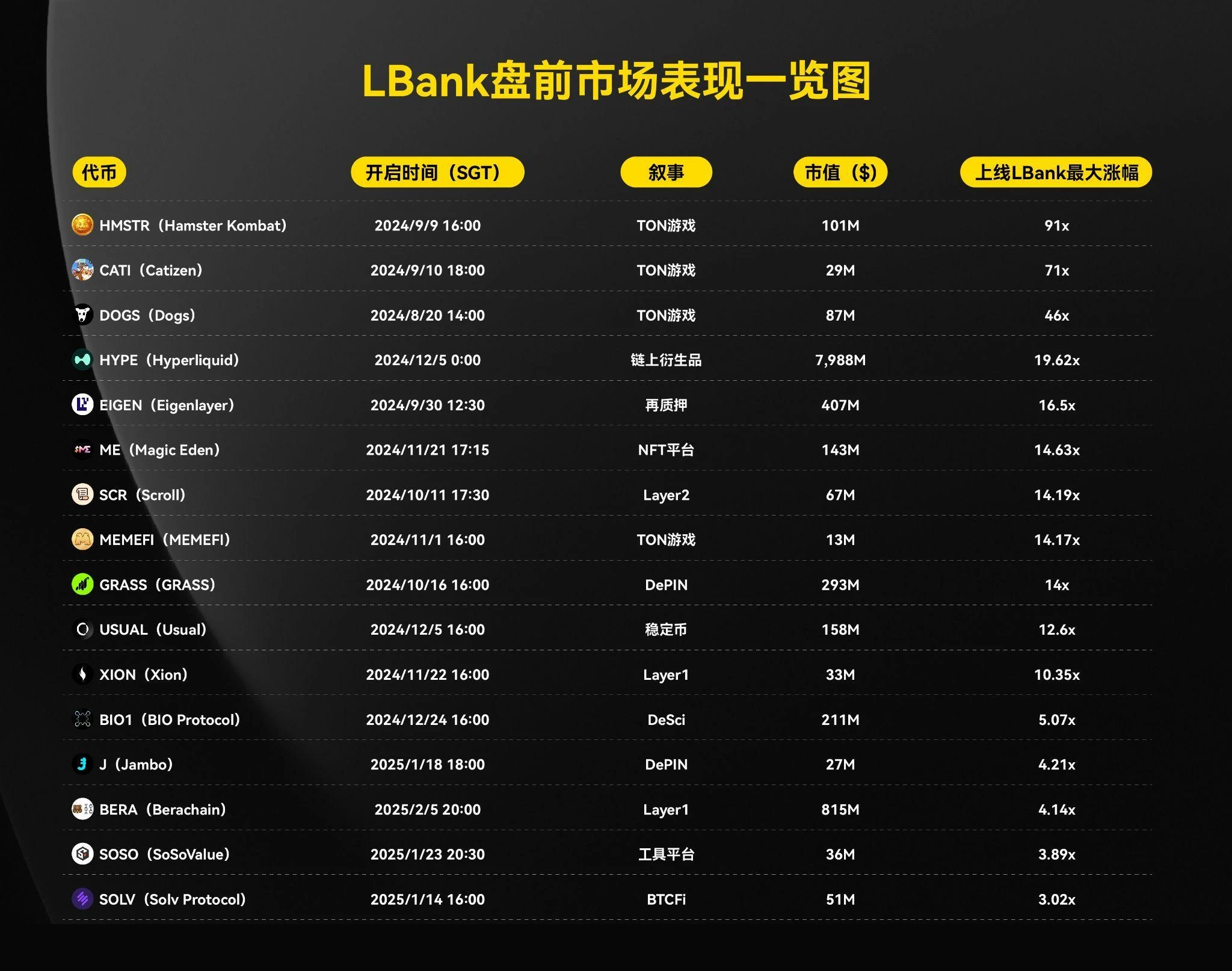 The types of projects in the pre-market are becoming increasingly diverse, from Layer 1 to DeFi tools, from on-chain derivatives to re-pledge projects, providing investors with a wider range of choices. Take LBank as an example, among its 15+ pre-market projects, there are many representative projects from different tracks such as BERA, SOLV, HYPE, and EIGEN. This diversified layout helps to disperse risks and improve the overall stability of the market.