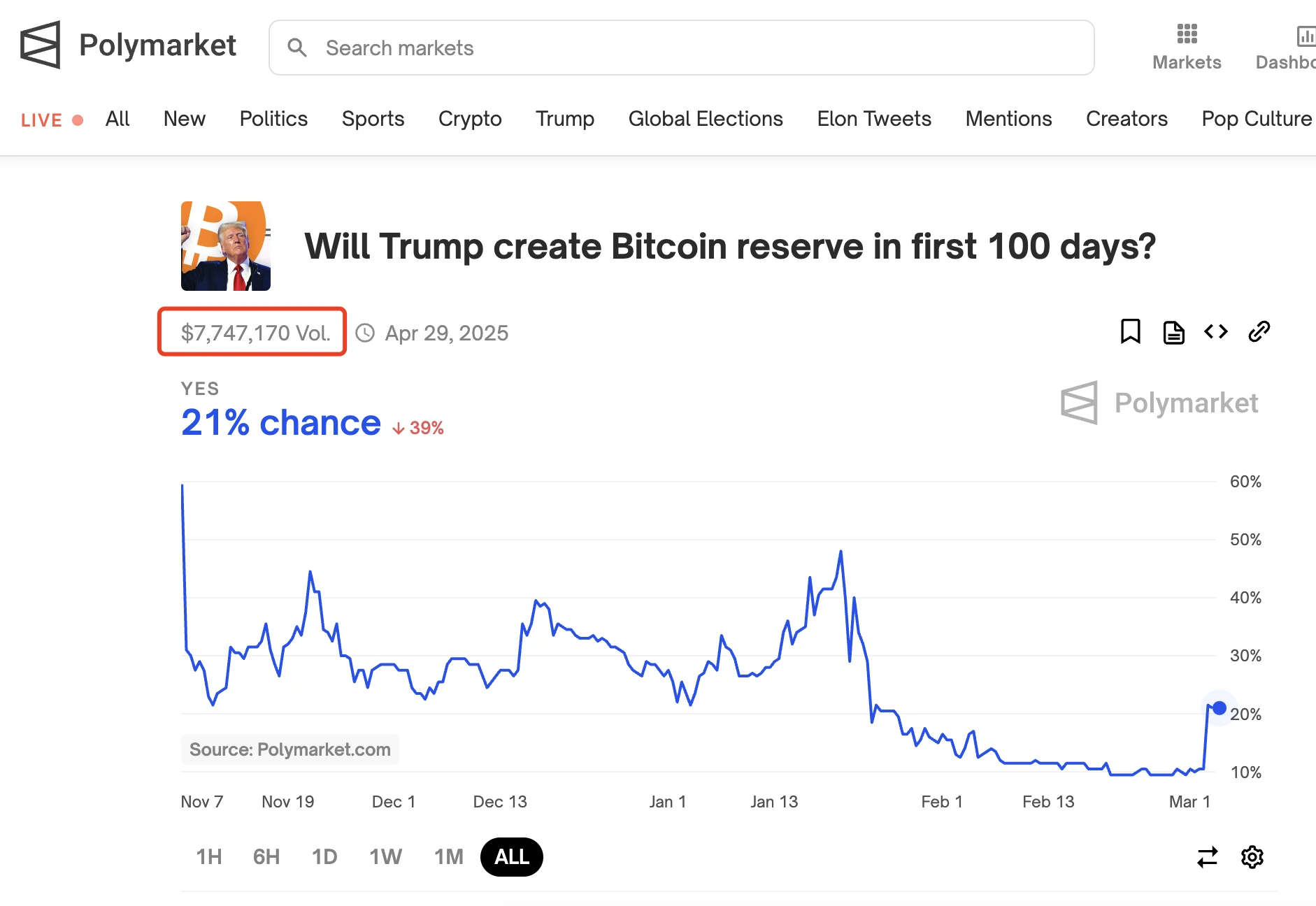 As of now, the probability of Trump establishing a strategic Bitcoin reserve within 100 days of taking office on Polymarket has risen to 21%, with the amount of bets being around $7.74 million. On January 20, the day Trump was sworn in as president, the probability of the bet once rose to 48%.