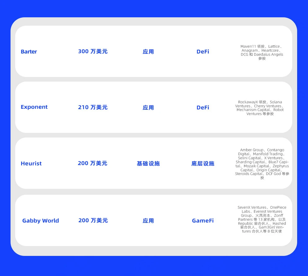 Sau đây là các sự kiện tài trợ cụ thể (Lưu ý: 1. Sắp xếp theo số tiền được công bố; 2. Không bao gồm các sự kiện gây quỹ và MA; 3. * biểu thị một công ty truyền thống có hoạt động kinh doanh liên quan đến blockchain):